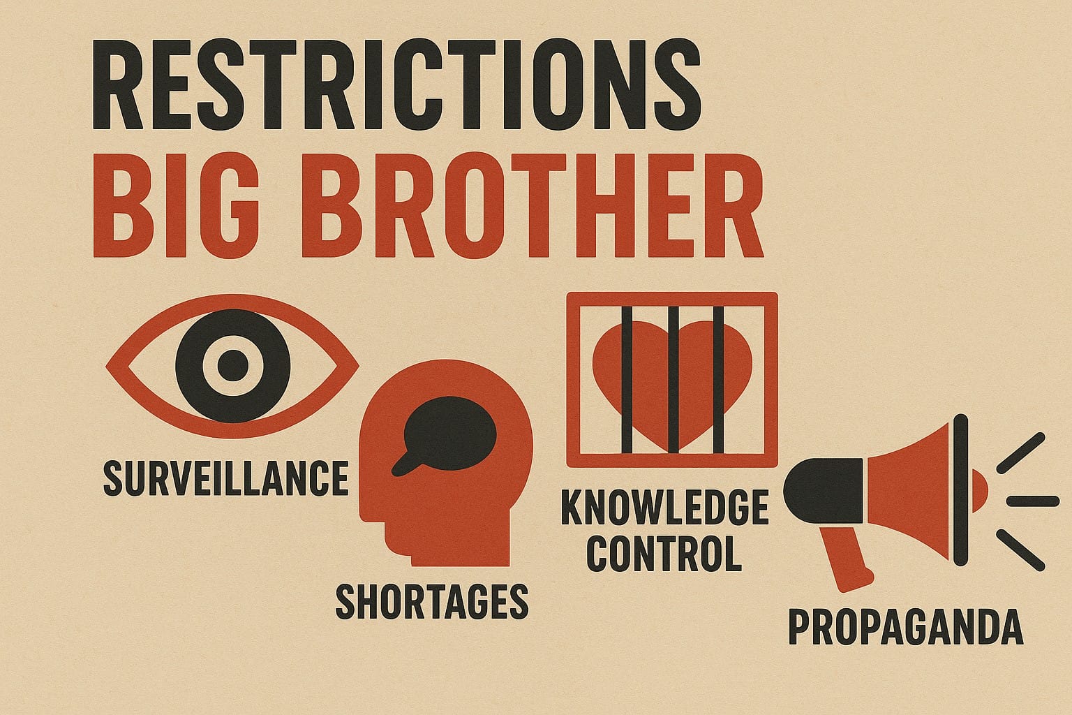- Surveillance and control: the slogan “Big Brother is watching you” embodies the idea of a state that monitors not only physical actions but thoughts (thought-crime).